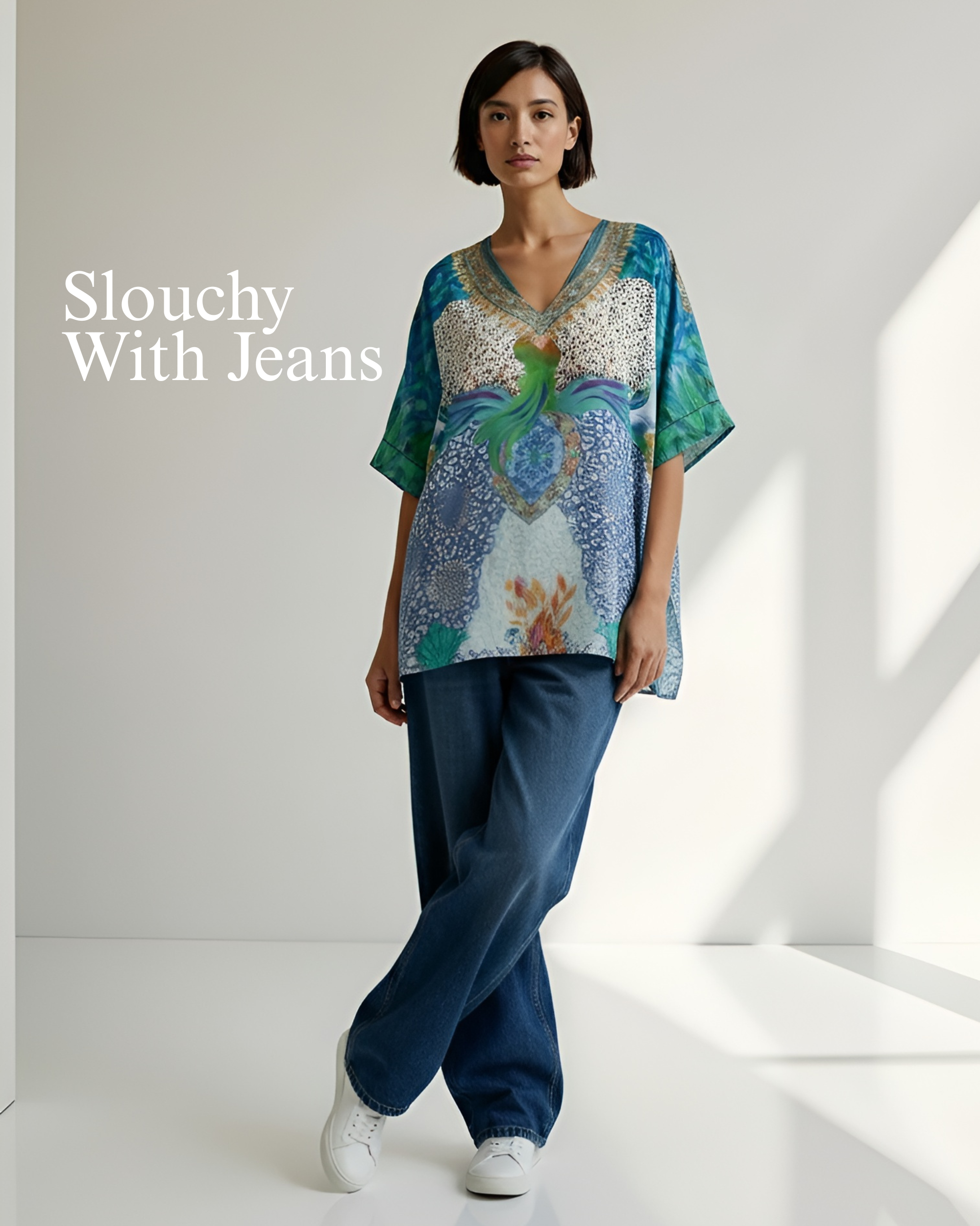 Styled simply with classic blue jeans and minimal footwear, the caftan top delivers an easy, lived-in feel. The relaxed drape and fluid cut balance denim’s structure for a look that feels modern and unfussy. A go-to option for everyday wear with quiet style confidence.
