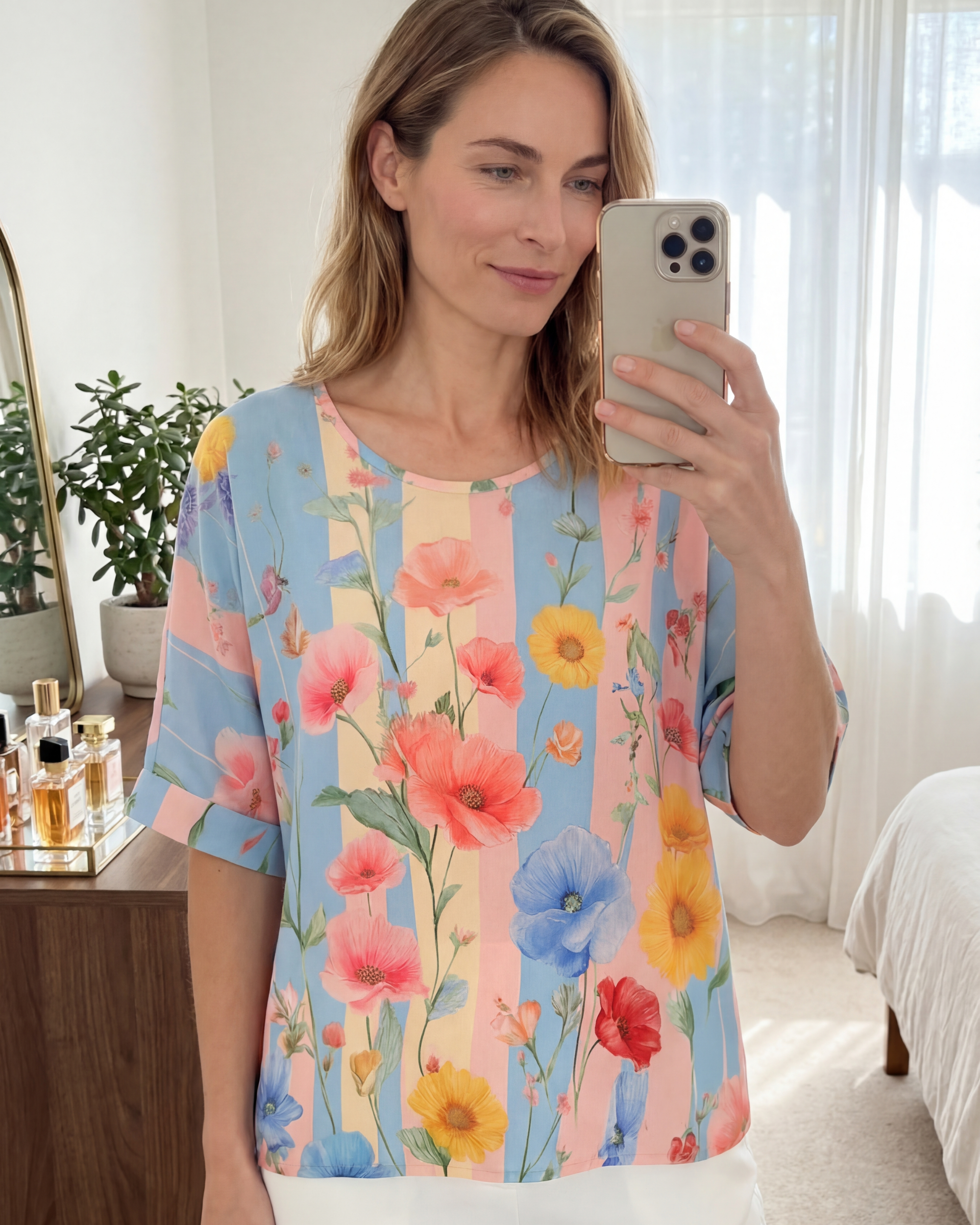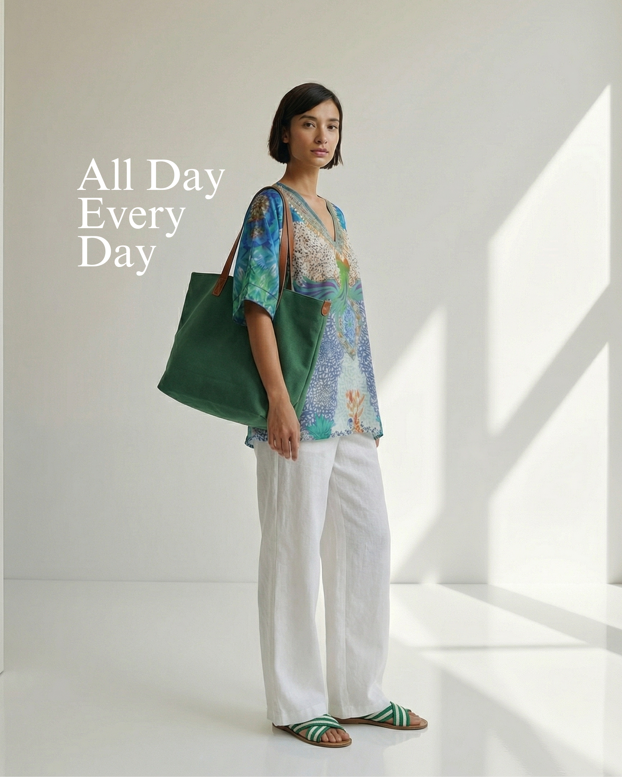 Layered with lightweight white trousers and finished with a soft carry-all tote, the caftan top becomes an all-day wardrobe essential. Comfortable, breathable, and endlessly adaptable, it moves seamlessly from errands to casual outings. A true foundation piece for effortless dressing.