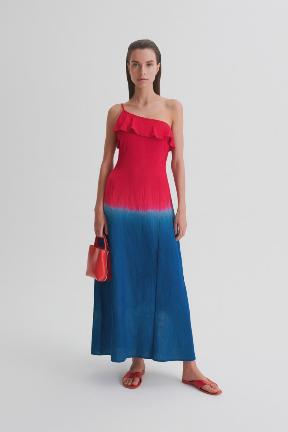 Crafted from a soft, lightweight fabric that drapes beautifully, this dress features a vibrant red bodice fading seamlessly into a deep ocean blue hem for a stunning ombré effect. The asymmetric neckline with a delicate ruffle detail adds a playful touch, while the single shoulder strap brings modern elegance and subtle allure.